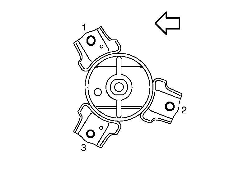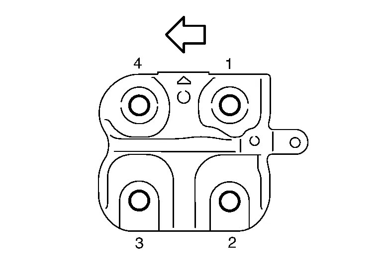 Tighten the engine mount bracket (front) bolts to specification in the order shown.