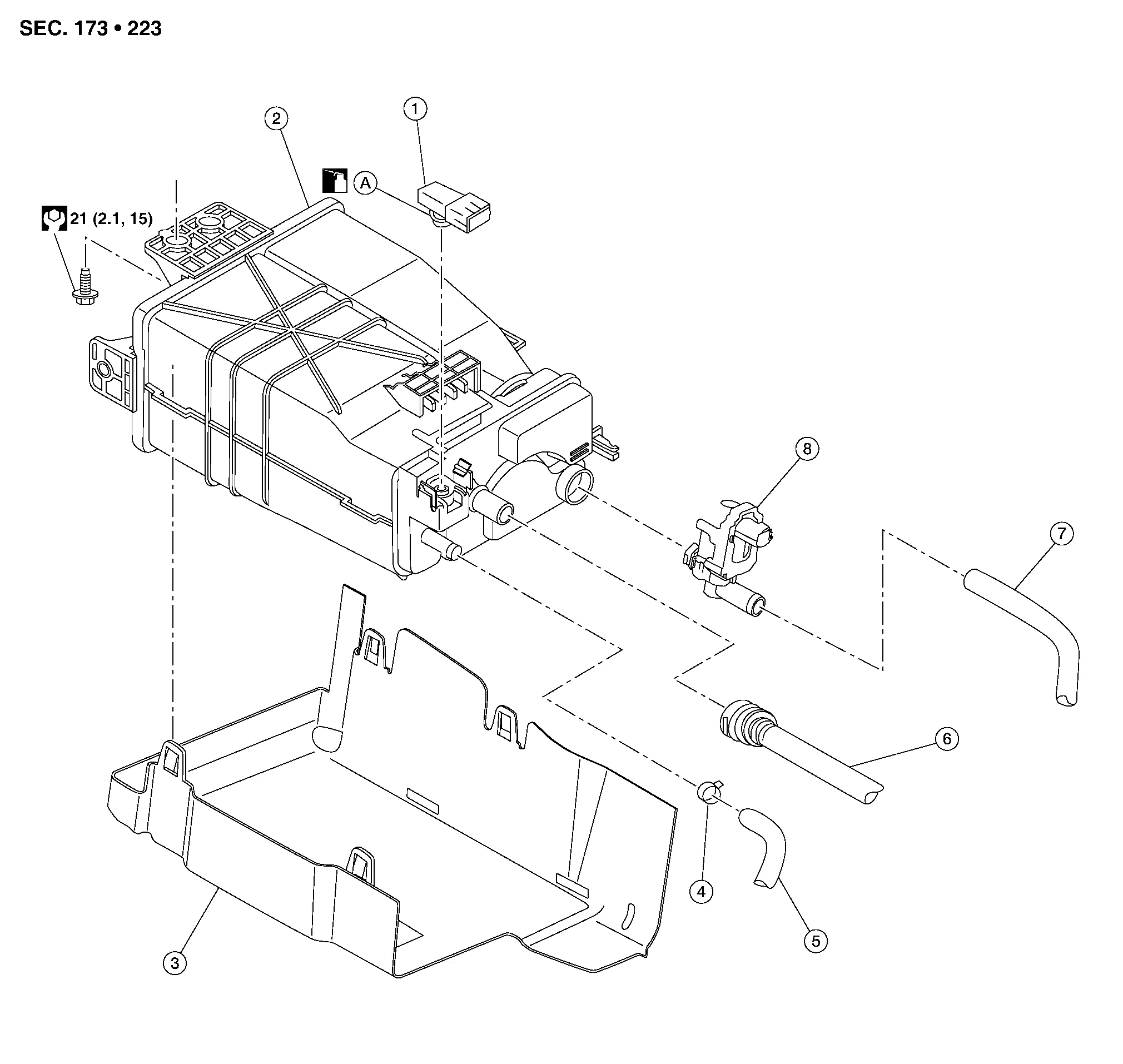 | 1. | EVAP canister control pressure sensor | 2. | EVAP canister | 3. | Shield |