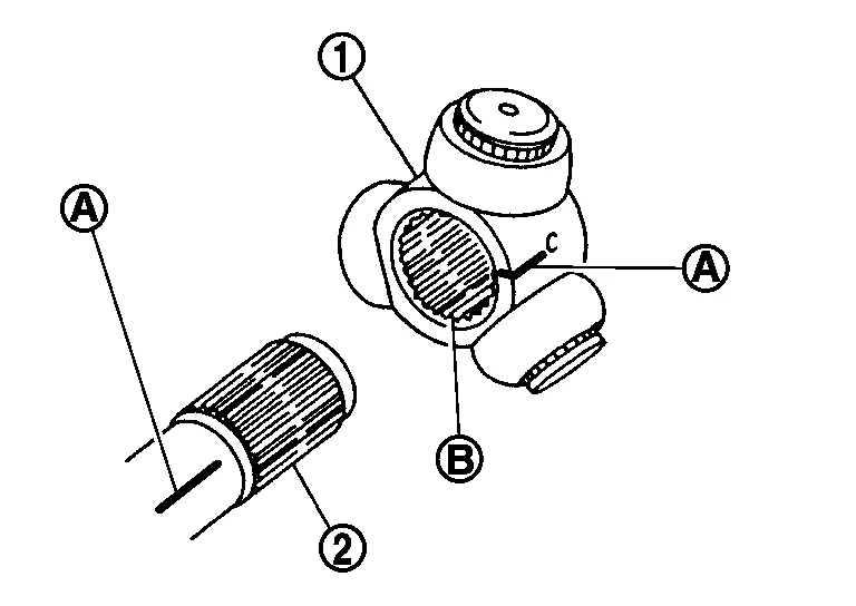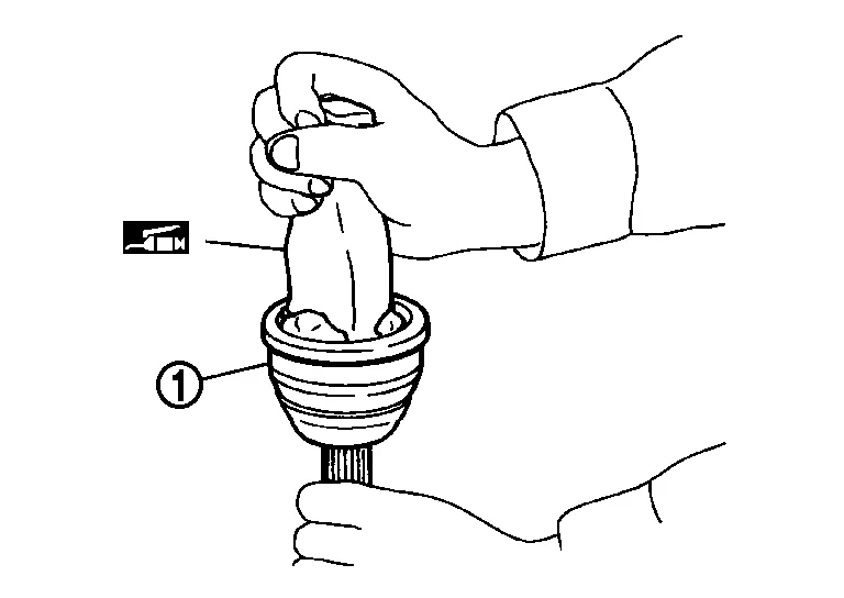 Insert Genuine NISSAN Grease into joint sub-assembly (1) serration hole until grease begins to ooze from ball groove and serration hole.