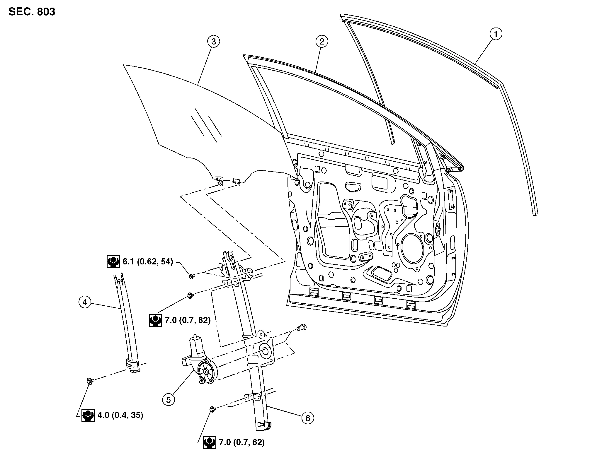 | 4. | Front door glass rear run | 5. | Front door power window motor | 6. | Front door glass regulator |
