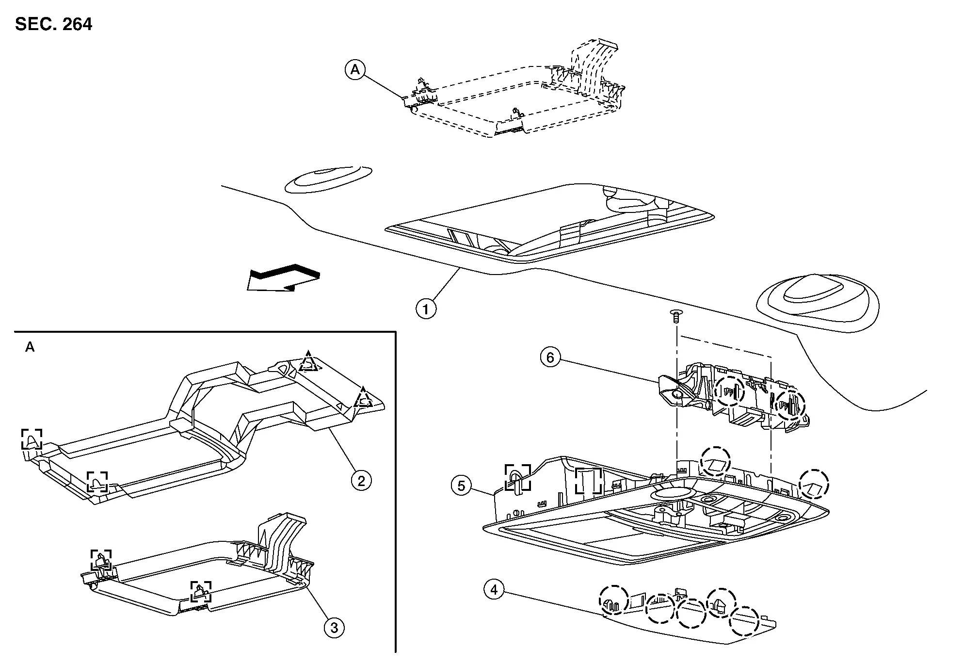 | 4. | Panoramic roof switch finisher | 5. | Front room/map lamp assembly | 6. | Map lamp |