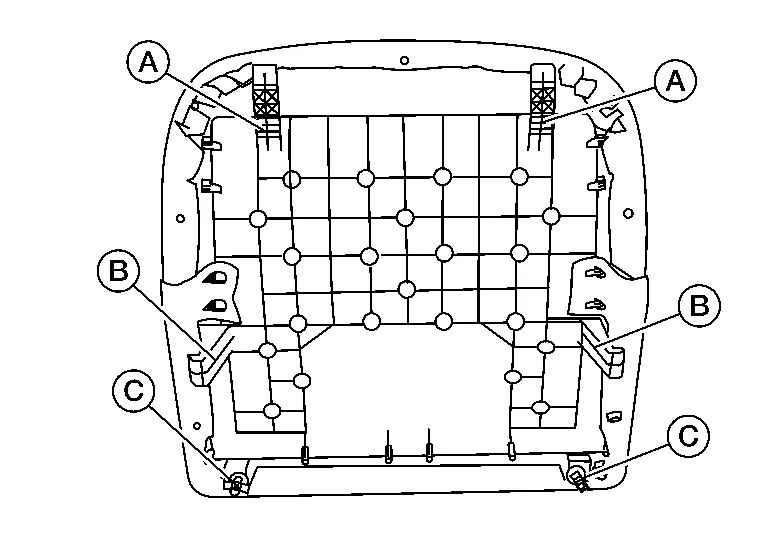 | A. | Rear hinge cover clips | B. | Seatback board clips | C. | Refer to Removal and Installation. |