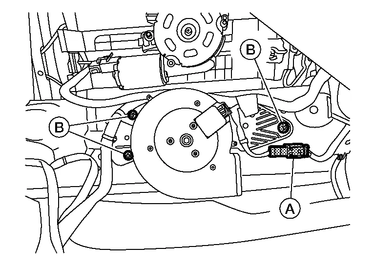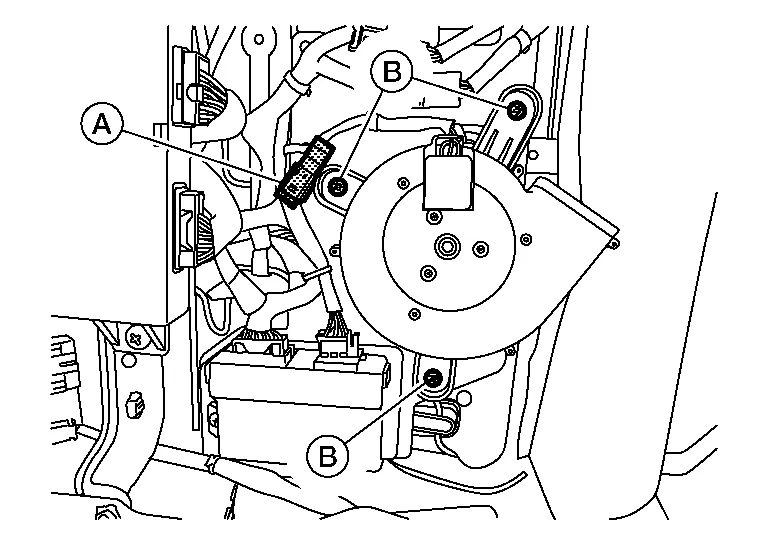 Disconnect harness connector (A) and remove screws (B) from the seat cushion blower.