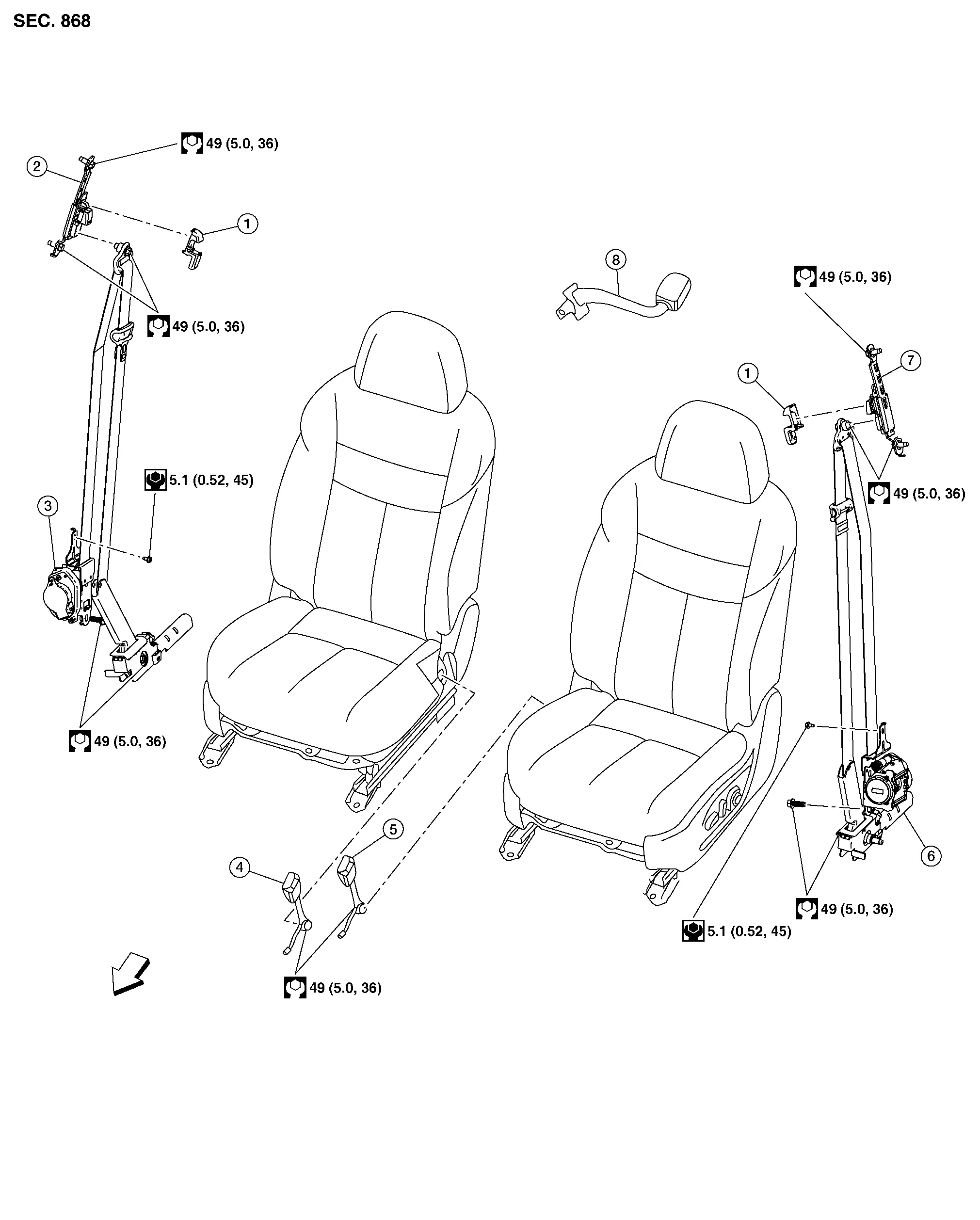 | 4. | Seat belt buckle (RH) | 5. | Seat belt buckle (LH) | 6. | Seat belt retractor (LH) |