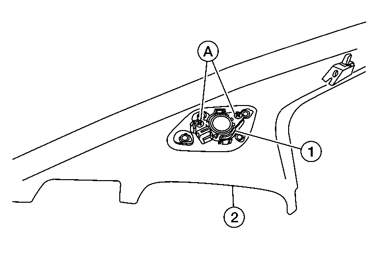 Remove screws (A) and remove front tweeter (1) from front pillar finisher (2).
