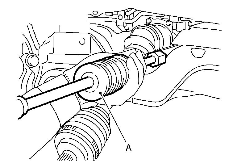 Insert suitable tool (A) between the drive shaft and transaxle. Remove the drive shaft from the transaxle (LH/RH).