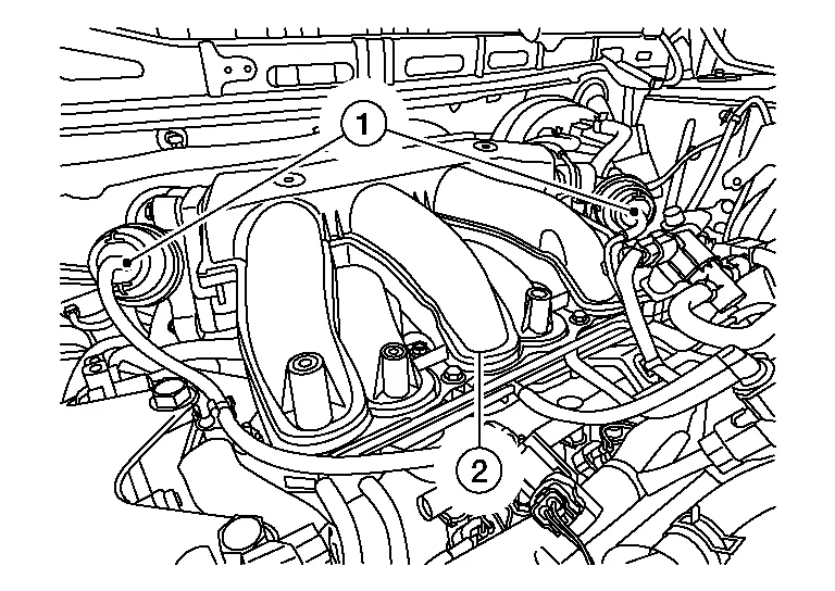 Disconnect vacuum hoses (1) from intake manifold collector (2).