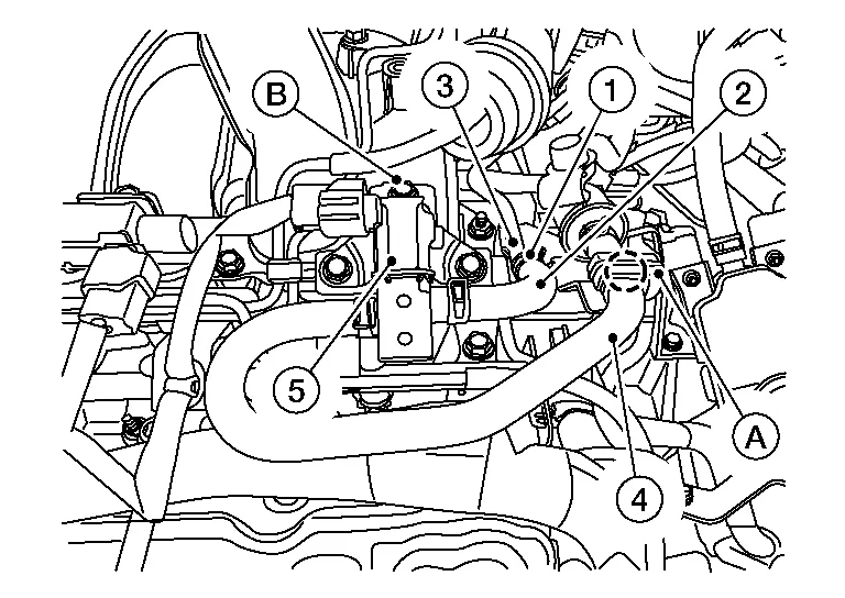 Remove CVT fluid cooler hose A and CVT fluid cooler hose B from the CVT oil warmer. Refer to Exploded View.