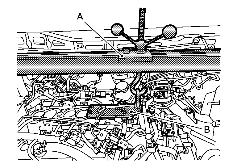 Install Tool (A) to Tool (B). Refer to Engine Support Tool Operating Instructions.