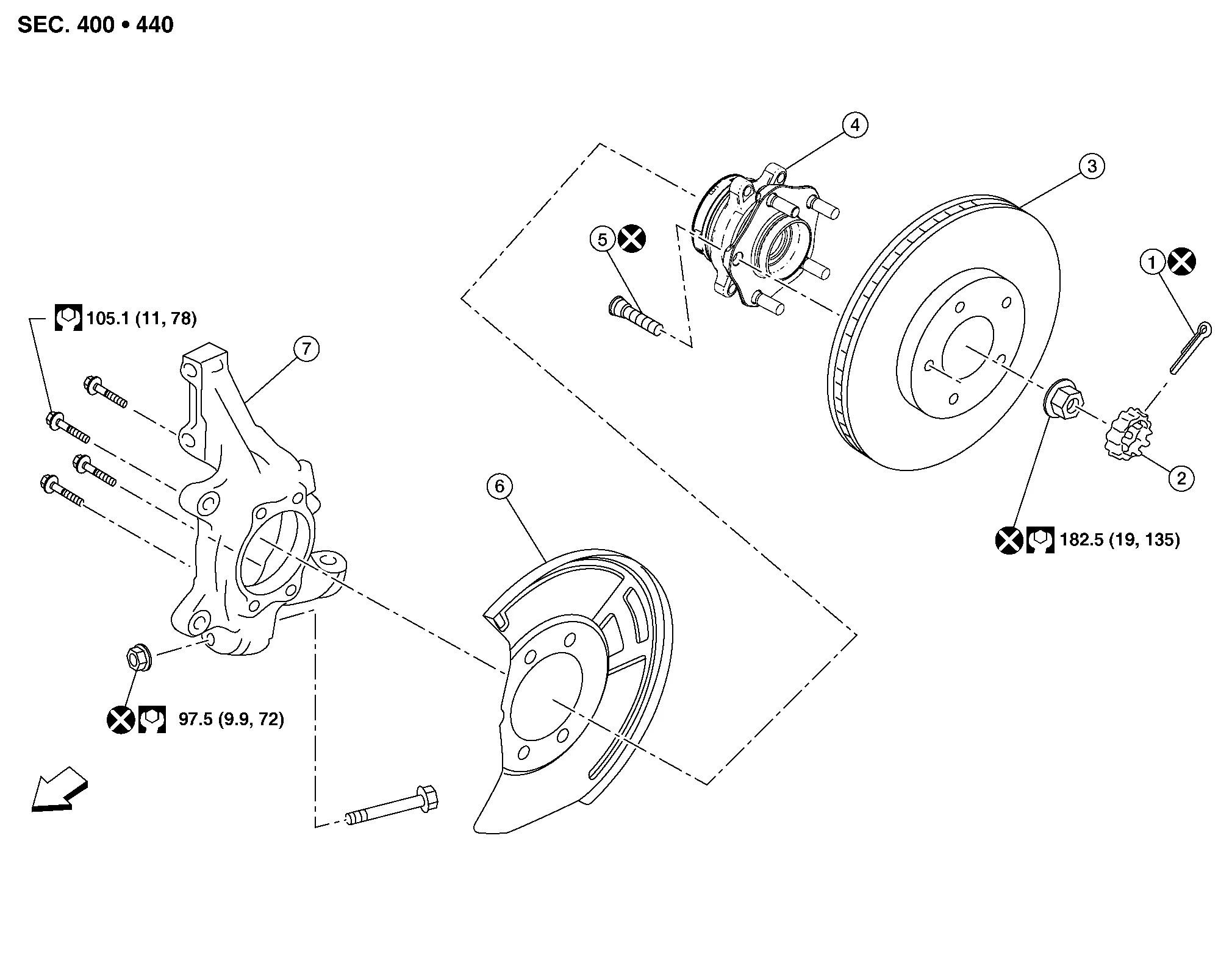 | 4. | Wheel hub and bearing | 5. | Wheel stud | 6. | Splash guard |