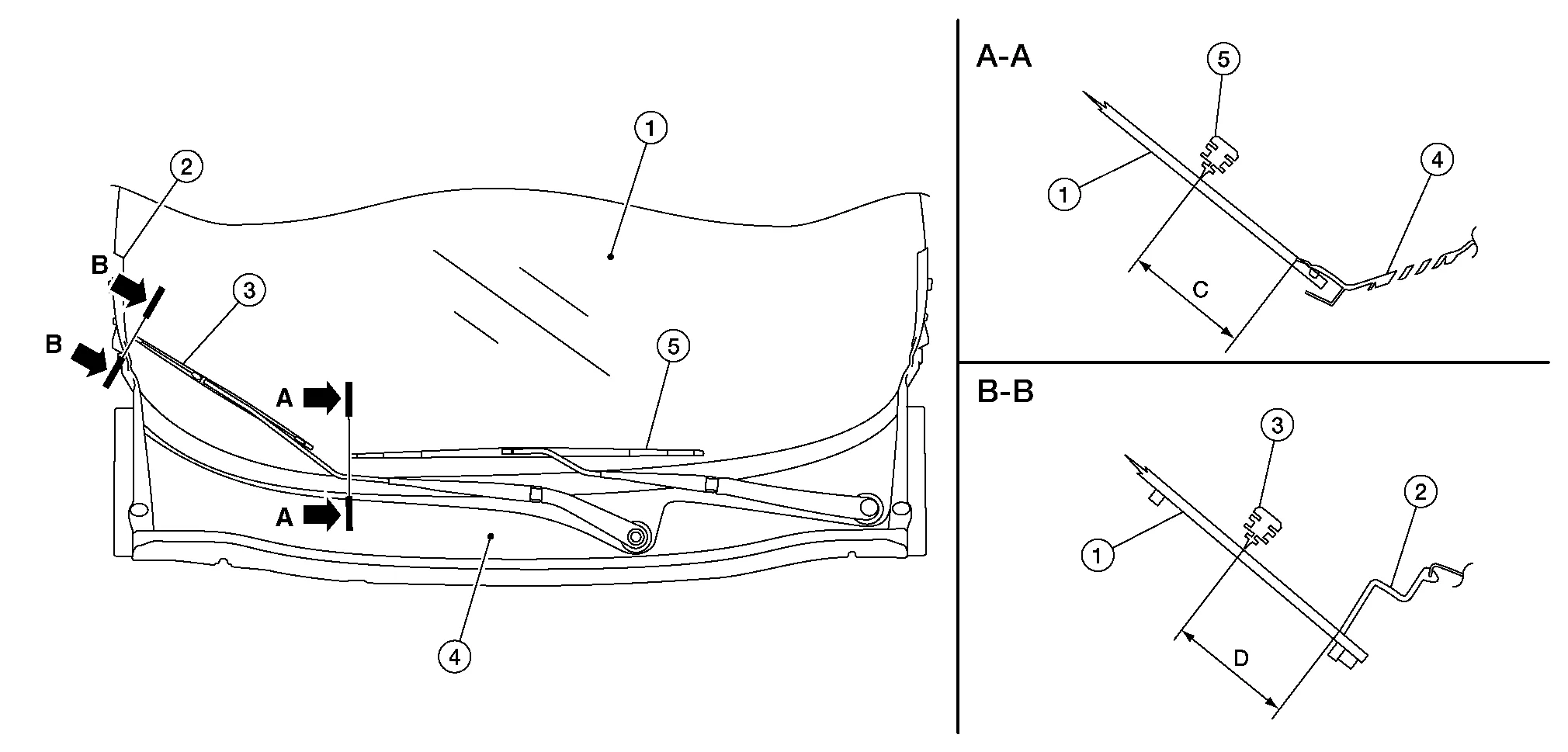 | 4. | Cowl top cover | 5. | Front wiper blade (LH) | C. | 41.6 mm ± 7. 5 mm (1.64 in ± 0.30 in) |