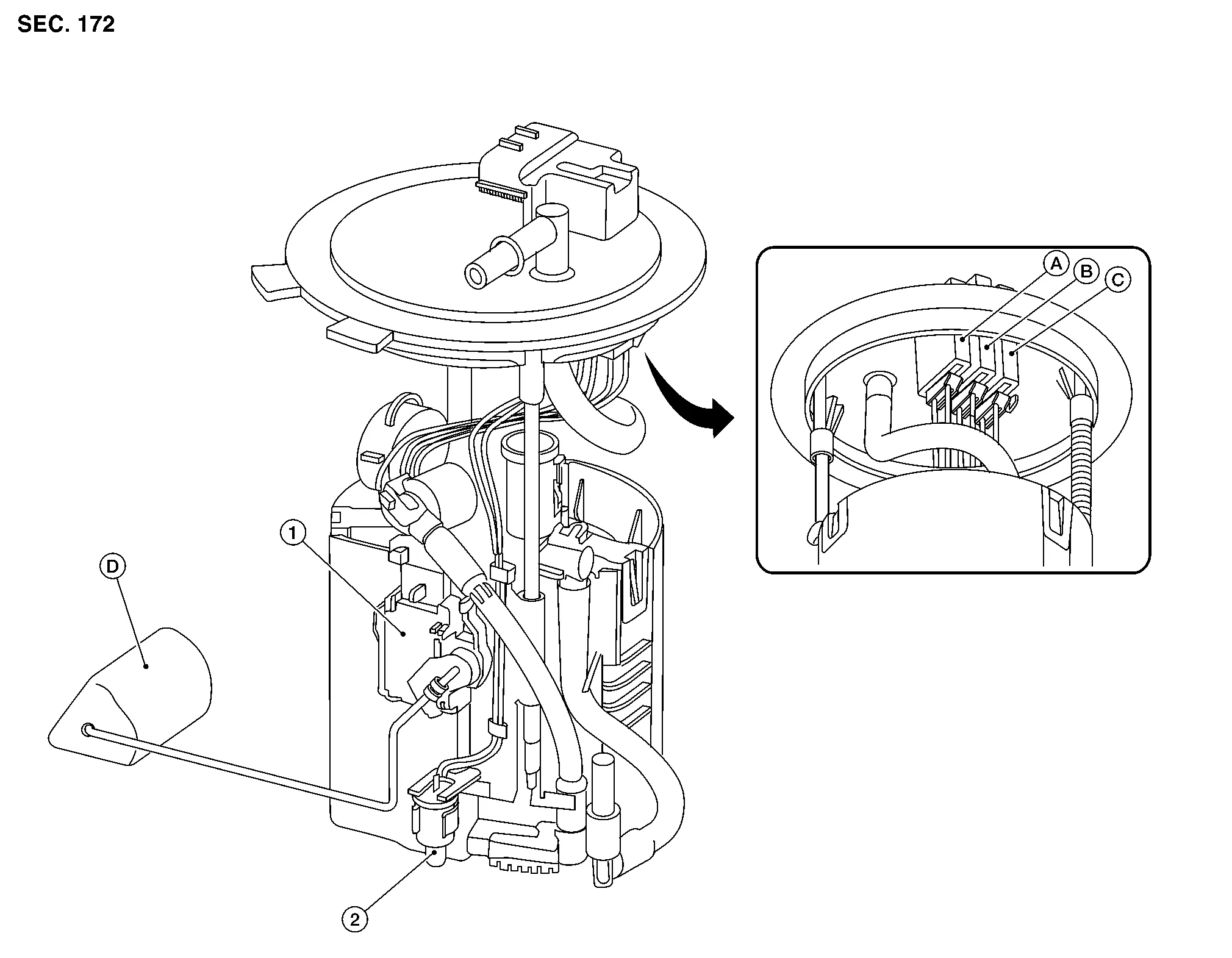 | B. | Fuel pump harness connector | C. | Fuel tank temperature sensor harness connector | D. | Float arm assembly |