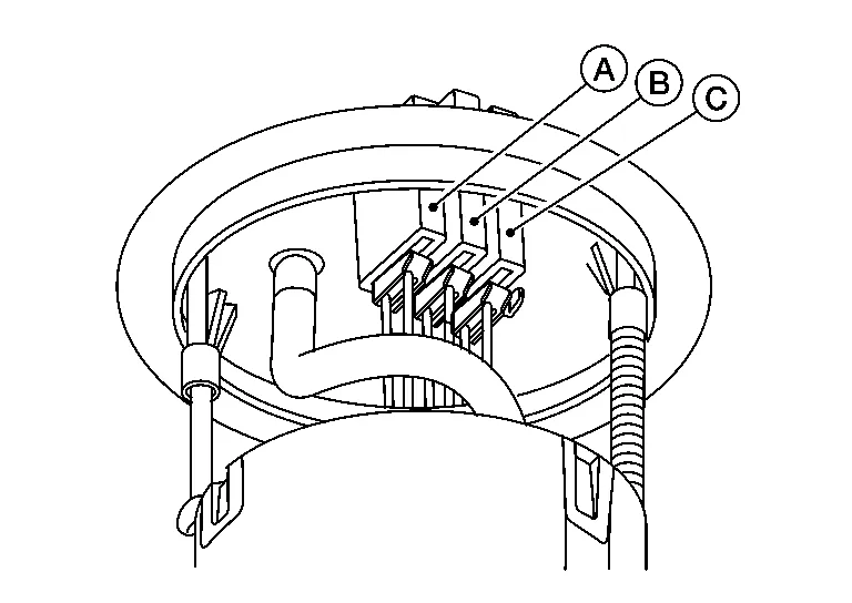Disconnect fuel level sensor unit (A) and fuel tank temperature sensor (C) harness connectors. Press the tabs on the terminals to release the locking tabs.