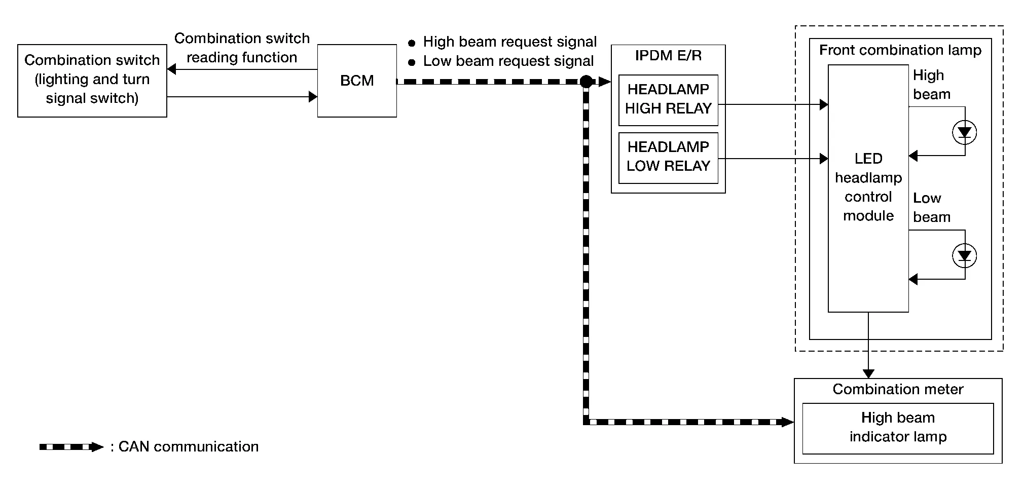 BCM transmits the high beam request signal to IPDM E/R and the combination meter via CAN communication according to the headlamp (HI) ON condition.