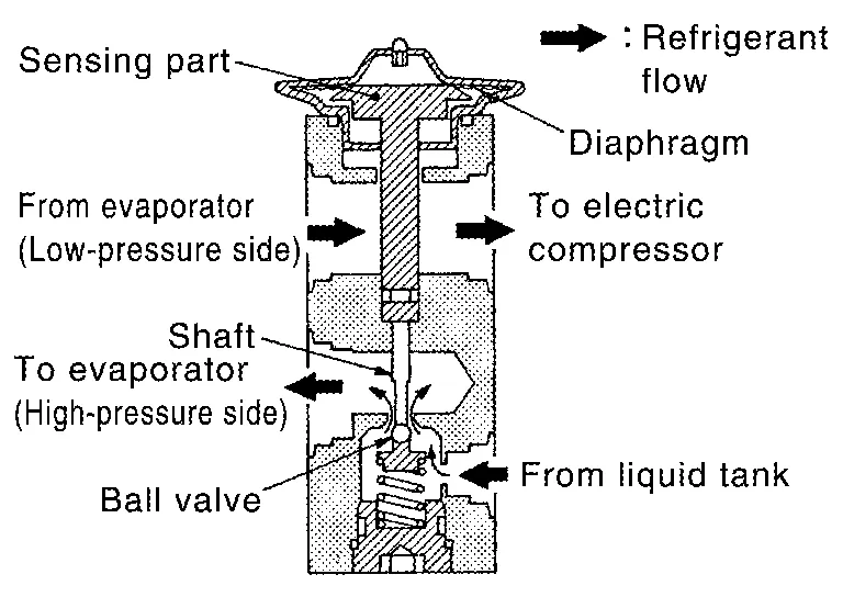 The refrigerant temperature is detected by the temperature sensing part located in low-pressure refrigerant path inside expansion valve. The lift amount of high-pressure side ball valve is changed to regulate the refrigerant flow.