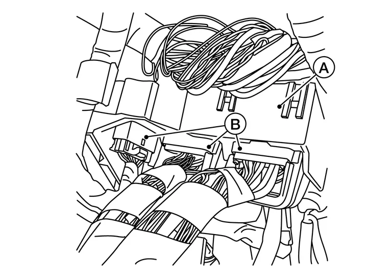 Disconnect the harness connectors (B) from the super multiple junction (SMJ) block (A).