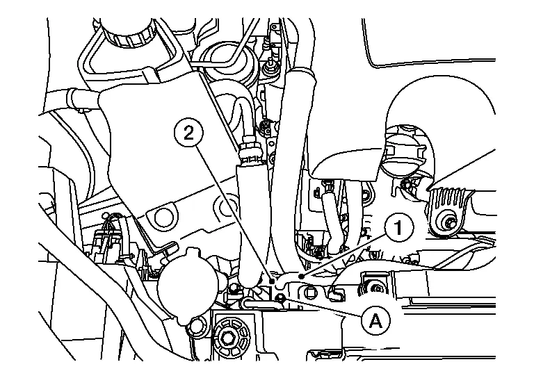 Remove bolt (A) and disconnect the high-pressure pipe (1) from the condenser pipe assembly (2).
