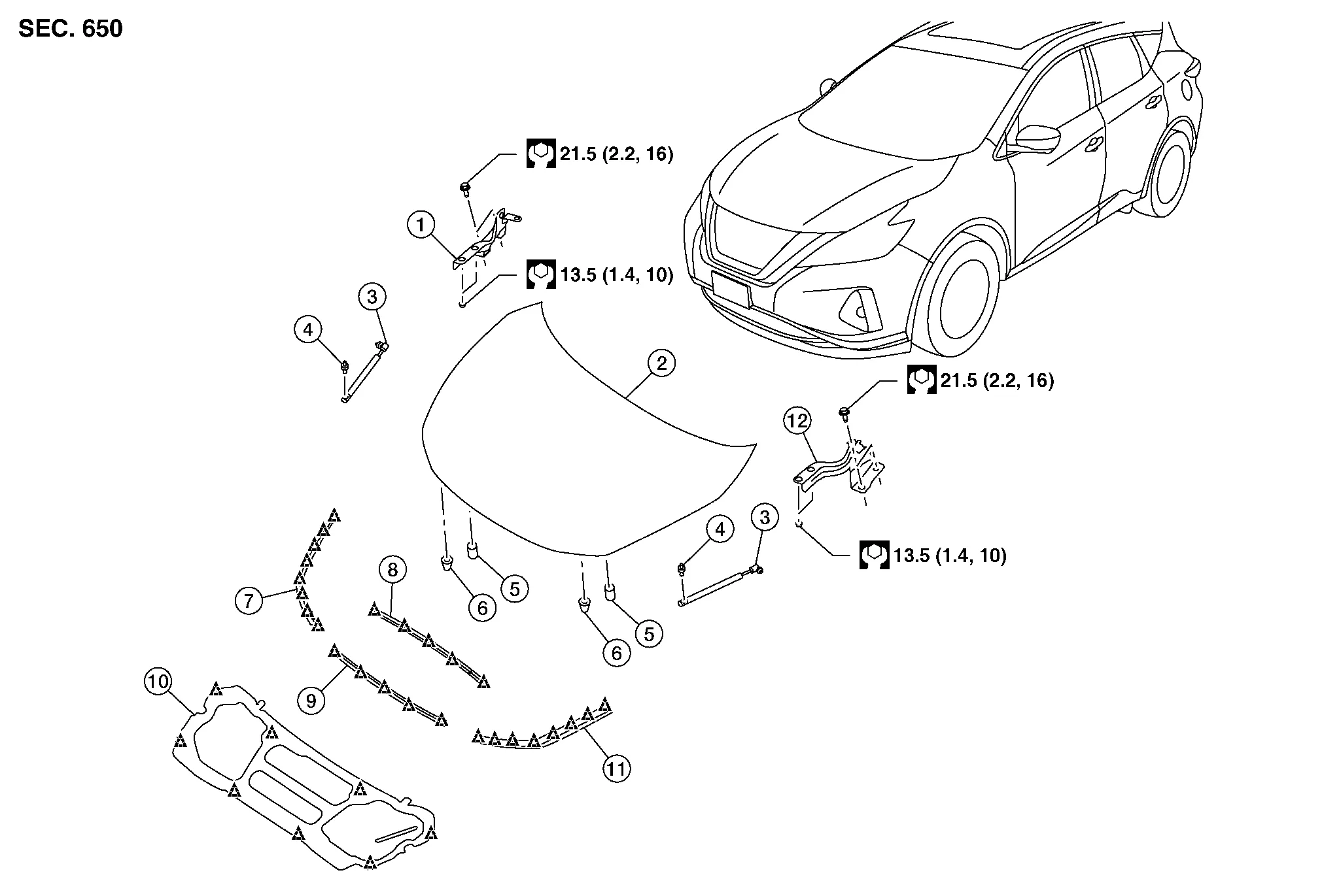 | 10. | Hood insulator | 11. | Hood side seal (LH) | 12. | Hood hinge (LH) |
