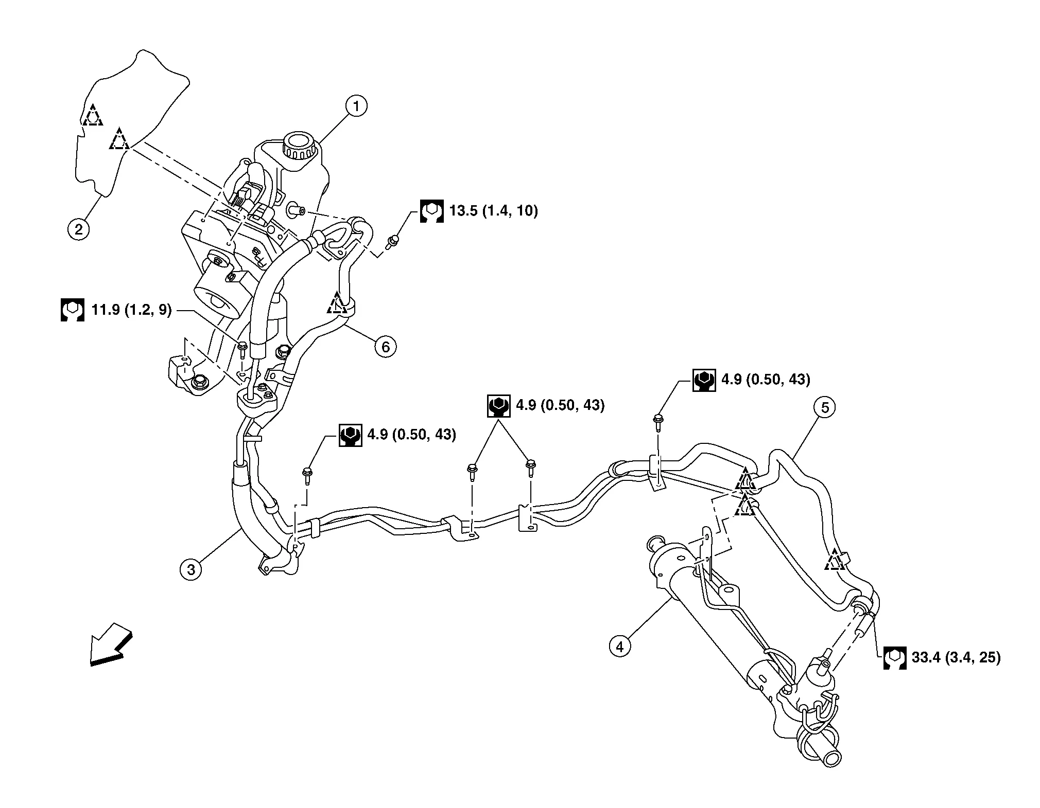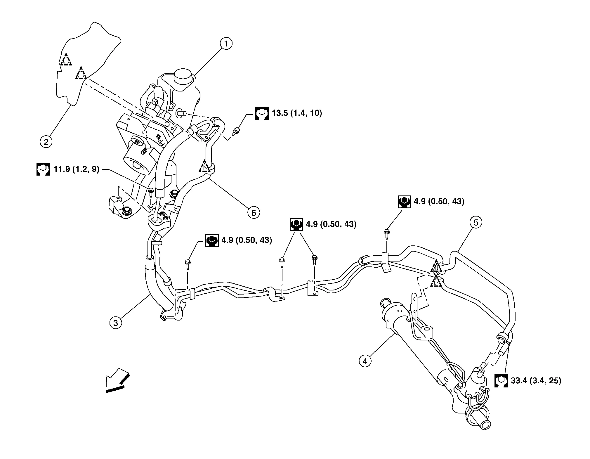 | 1. | Power steering oil pump | 2. | Cover | 3. | High-pressure piping |