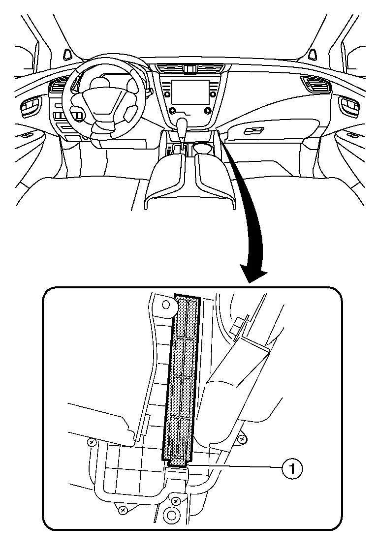 The in-cabin microfilter is marked with an air flow arrow. The end of the microfilter with the arrow should face the passenger side of the Nissan Murano vehicle. The arrow should point towards the rear of the vehicle.