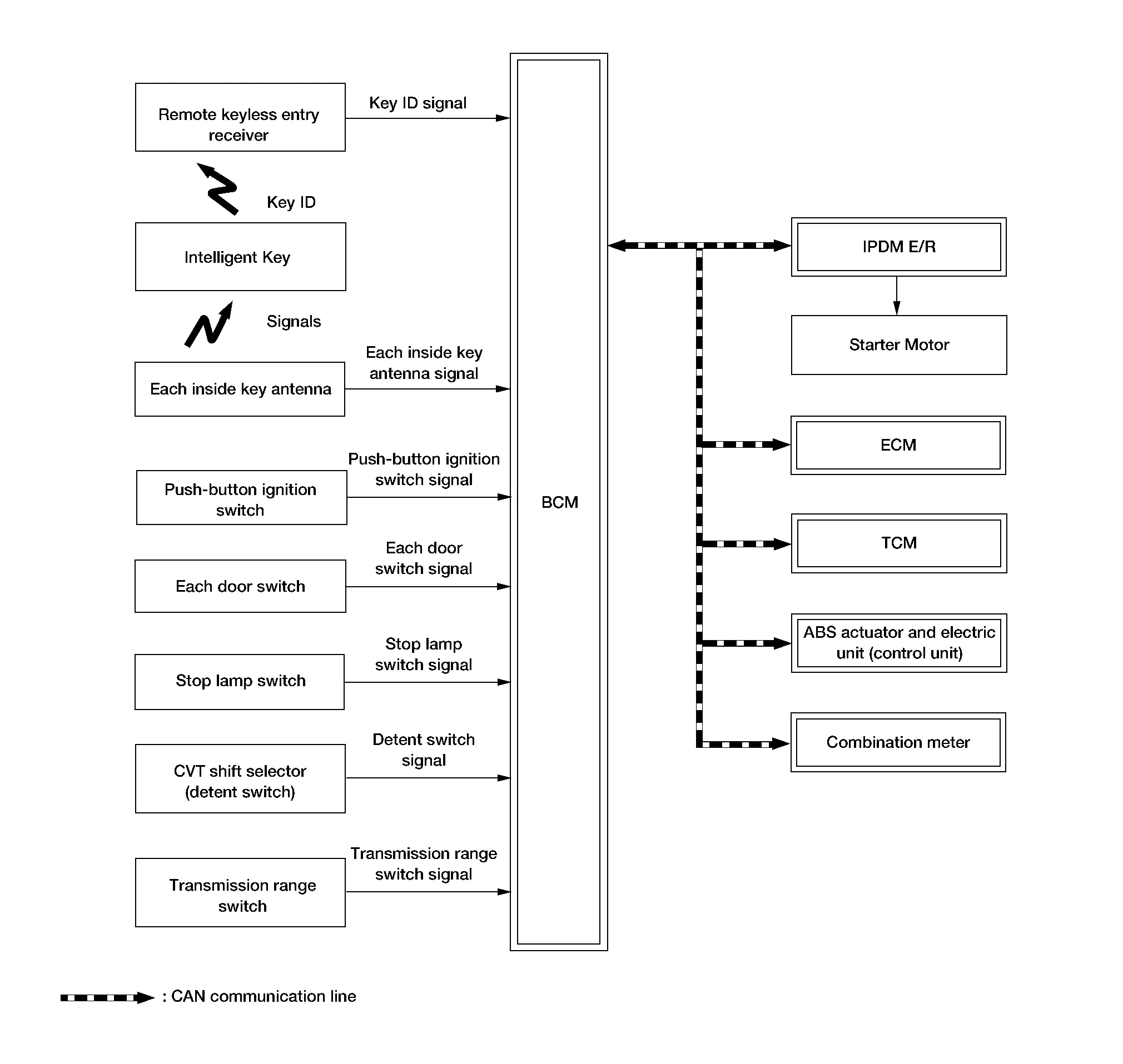 Mainly transmits the following signal to BCM, ECM and IPDM E/R via CAN communication.
