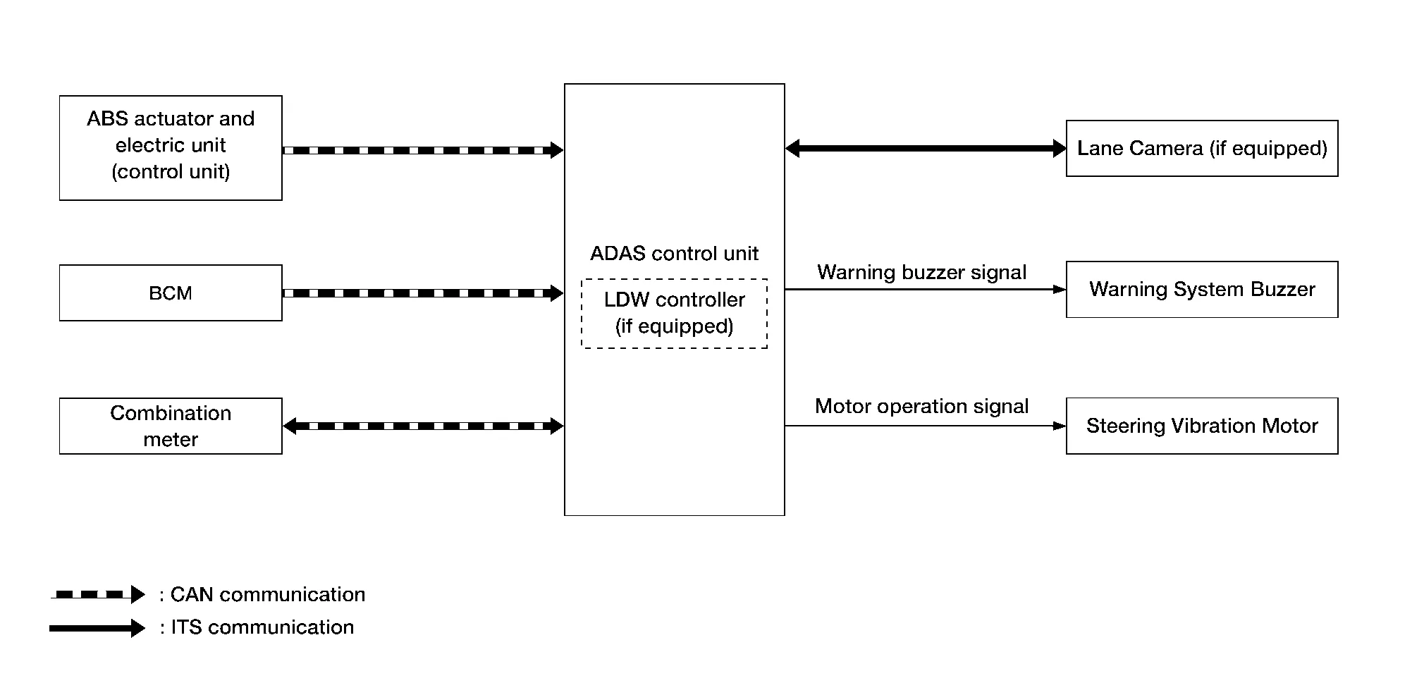 | Combination meter | CAN communication | Lane departure warning lamp signal | Transmits a lane departure warning lamp signal to turn ON the lane departure warning lamp | |