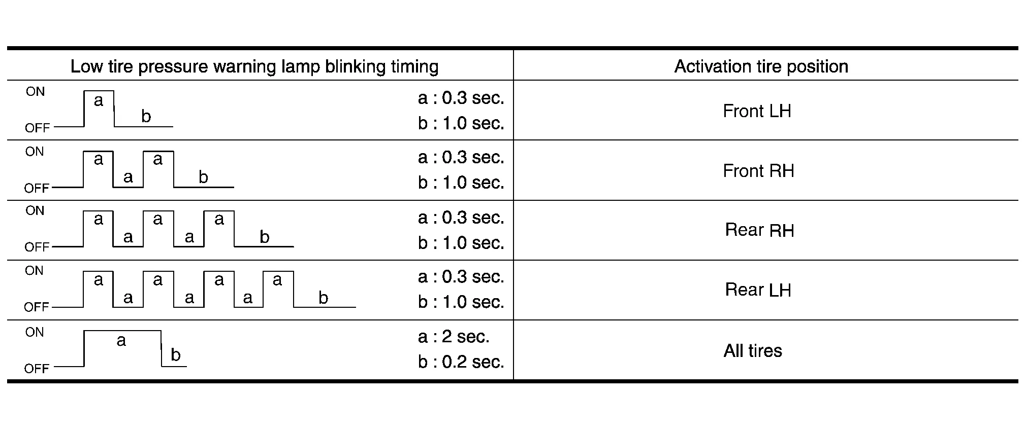 The position of an inactive tire pressure sensor can be identified by checking the blinking timing of the low tire pressure warning lamp.