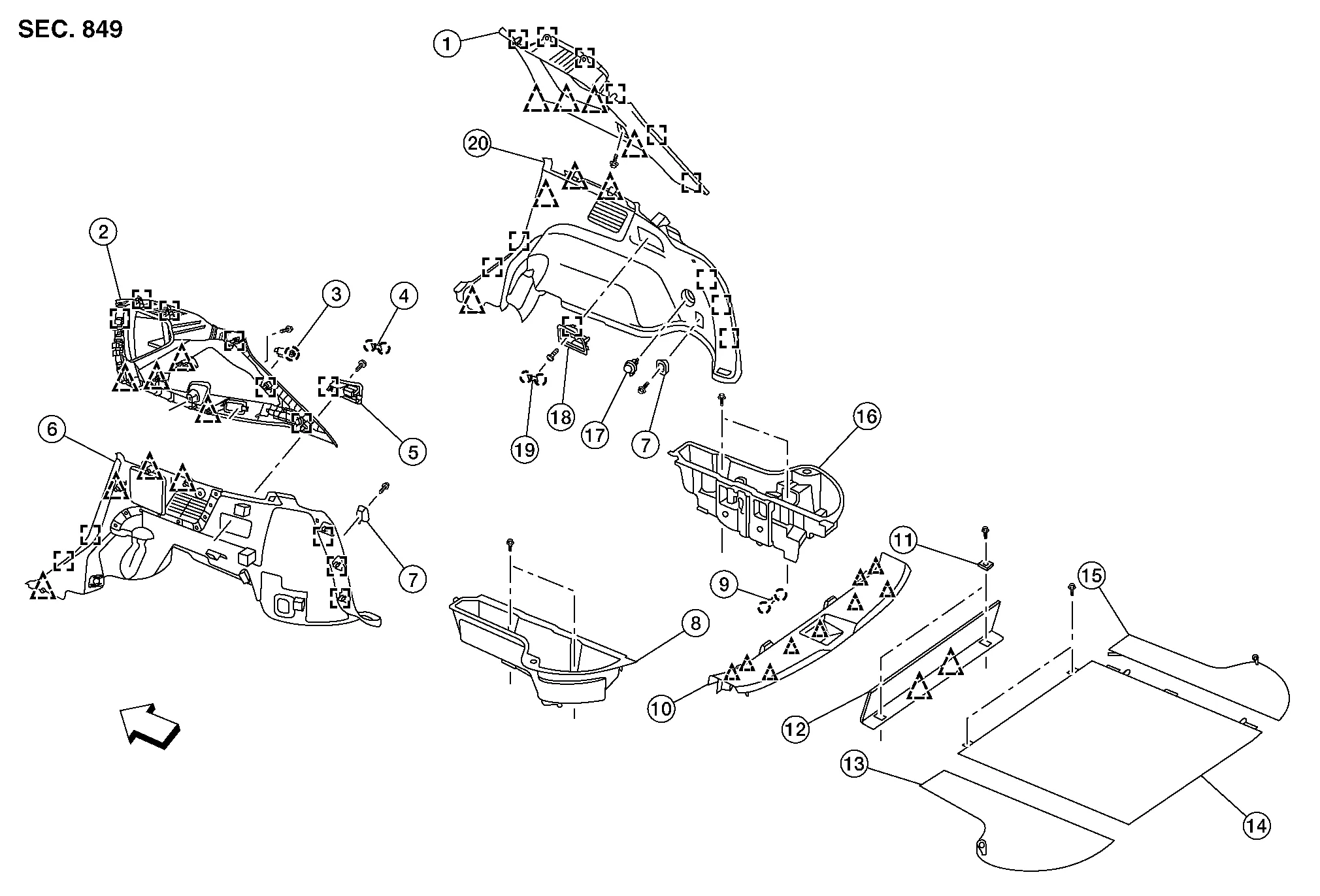 | 13. | Luggage floor side finisher (LH) | 14. | Luggage floor rear finisher | 15. | Luggage floor side finisher (RH) |