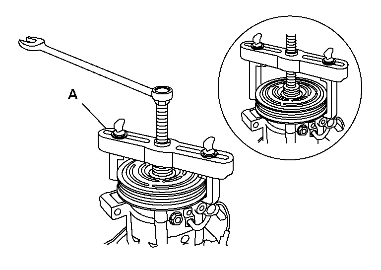 Remove the pulley assembly using a suitable tool (A) as shown.