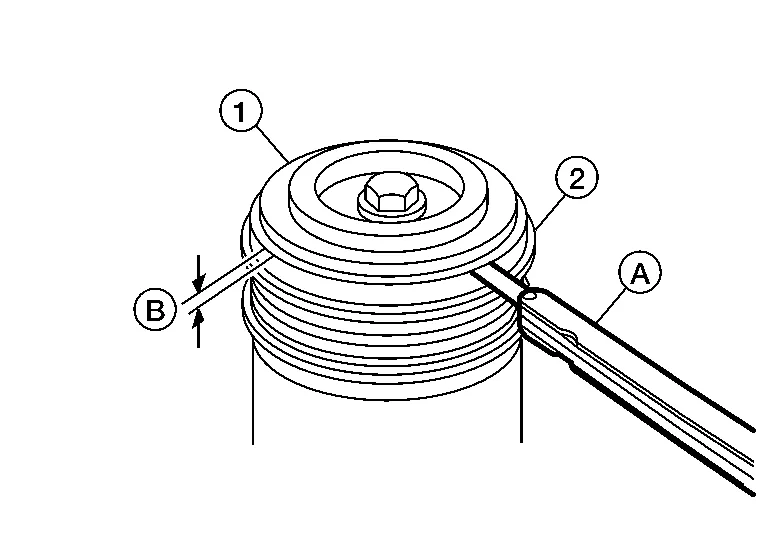 Check the clearance (B) all the way around between the clutch disc (1) and pulley (2) using a suitable tool (A) as shown.