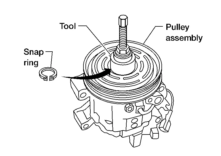 Install the pulley assembly using Tool and a wrench as shown then install the snap ring using a suitable tool.