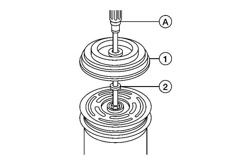 Install the clutch disc (1) on the drive shaft together with all of the original shim(s) (2) using a suitable tool (A).