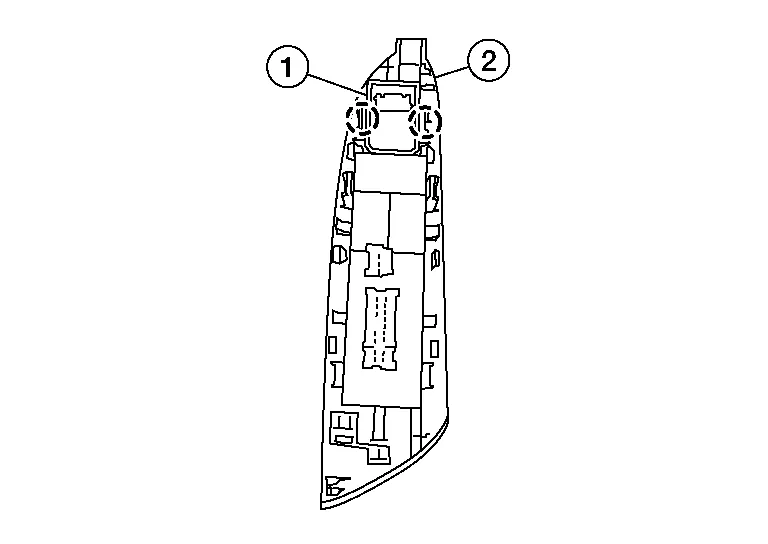 Release pawls and remove door mirror remote control switch (1) from main power window and door lock/unlock switch finisher (2).