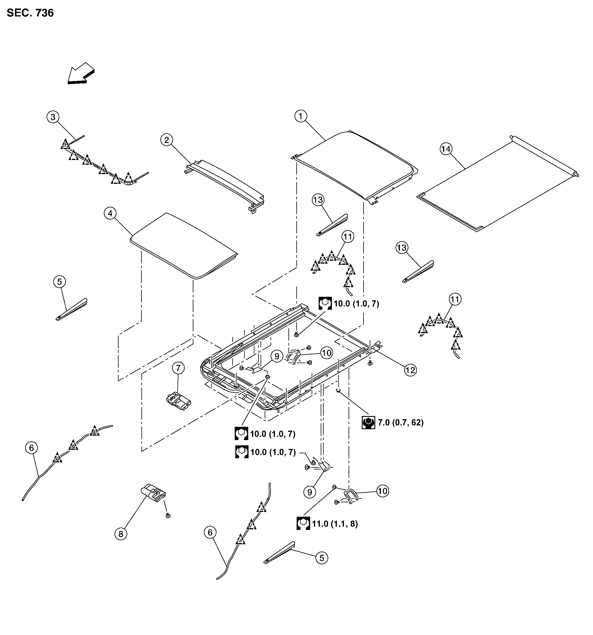 | 7. | Moonroof motor assembly | 8. | Sunshade motor assembly | 9. | Moonroof front bracket (LH/RH) |