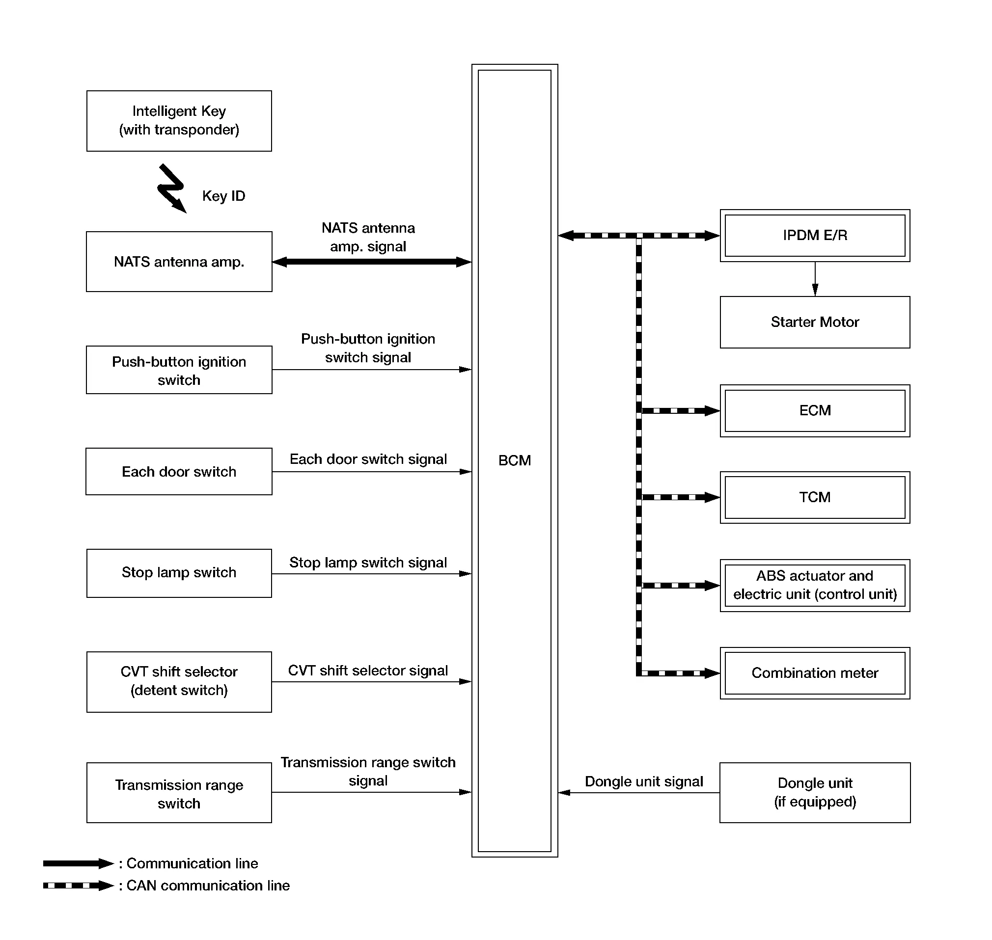 Mainly transmits the following signal to BCM, ECM and IPDM E/R via CAN communication.