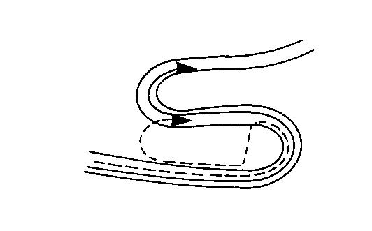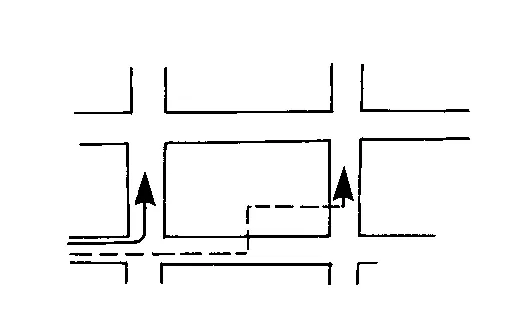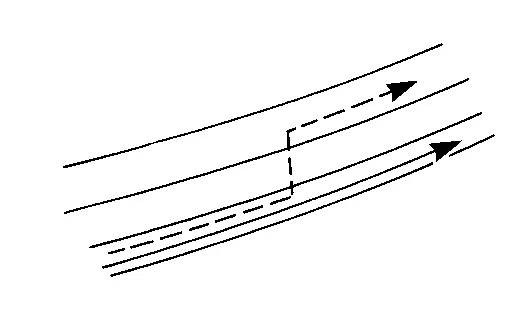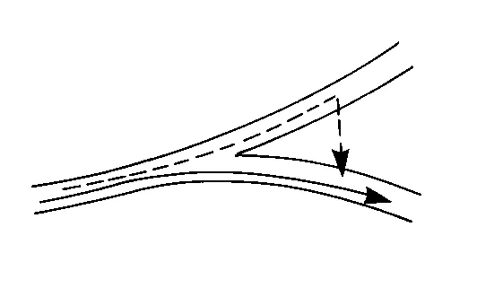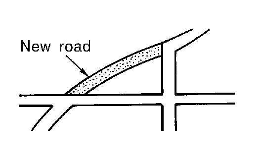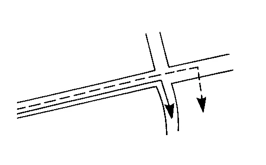 At a Y intersection or similar gradual division of roads, an error in the direction of travel deduced by the sensor may result in the current-location mark appearing on the wrong road. | If after travelling about 10 km (6 miles) the correct location has not been restored, perform location correction and, if necessary, direction correction. |