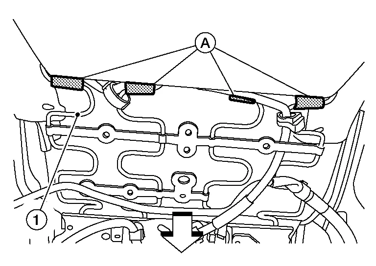 For models with power front passenger seat, perform the following procedure.Tilt the front passenger seat rearward and attach the harness clips (A) to the seat frame assembly (1).