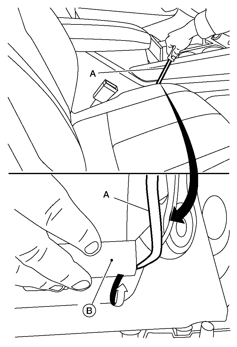 Push the J-hook (B) down and towards the seat frame assembly using suitable tool (A) as shown.