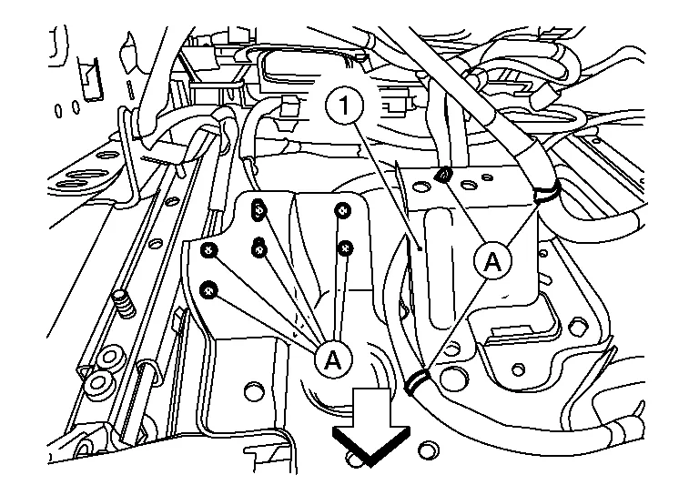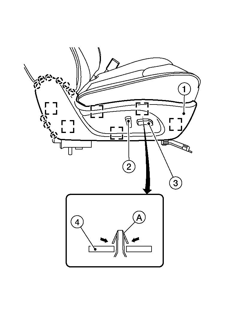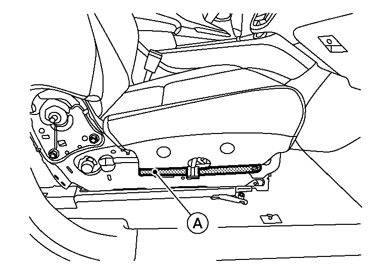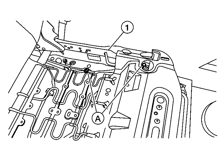 For models with power front passenger seat, perform the following procedure.Tilt the front passenger seat rearward and release the harness clips (A) from the seat frame assembly (1).