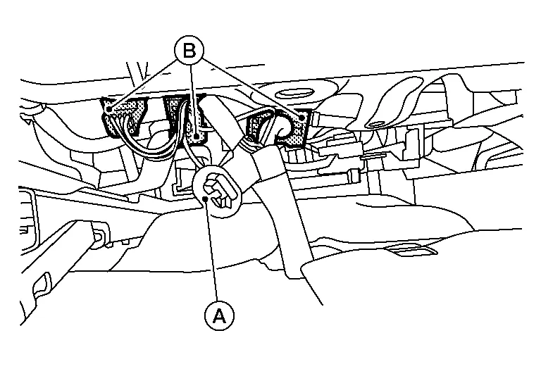 For models with manual front passenger seat, release the harness clip (A) from the seat frame assembly, then disconnect the harness connectors (B).