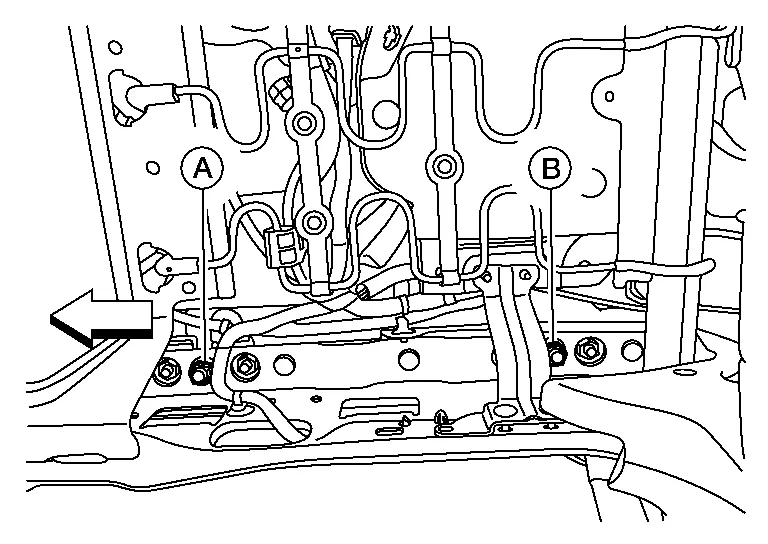 Remove the seat frame assembly nuts from the seat tracks using the following procedure.Remove washer and nut (A) from the front LH (inboard) side of the seat frame assembly, and nut (B) from the rear LH (inboard) side of the seat frame assembly.