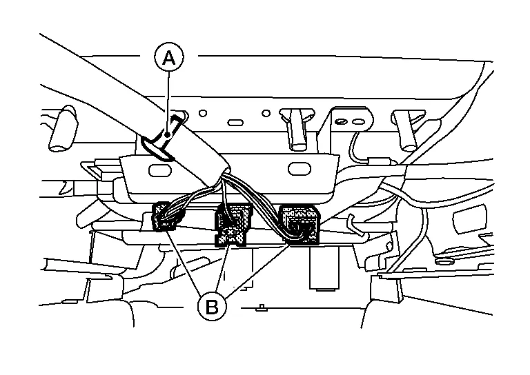 For models with power front passenger seat, release the harness clip (A) from the seat frame assembly, then disconnect the harness connectors (B).