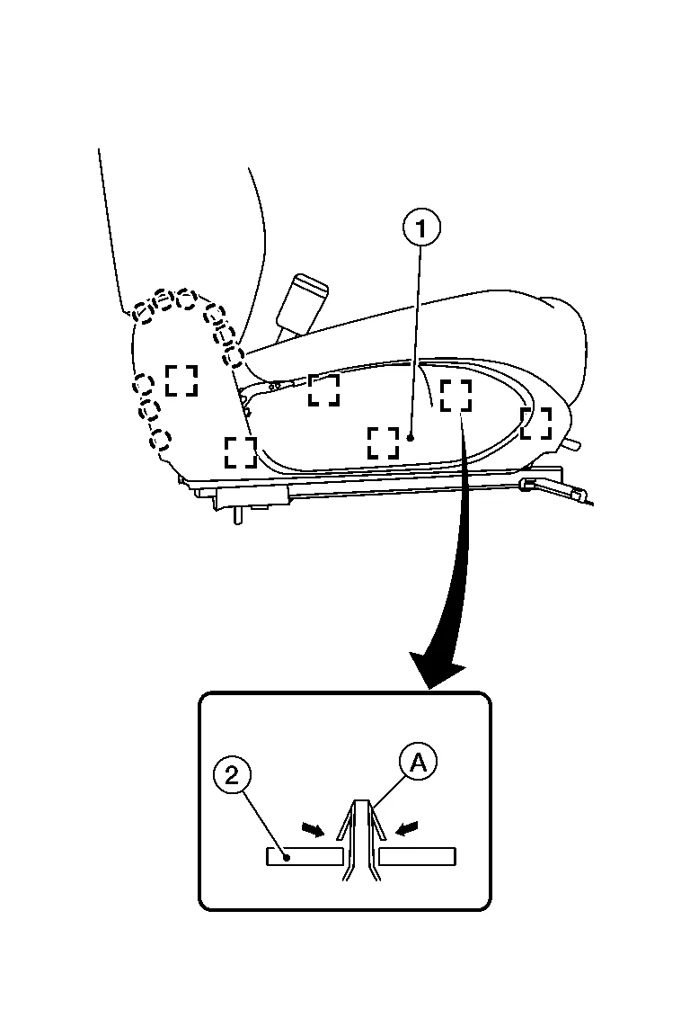 Release the metal clips (A) from the seat frame (2) as shown, and pull the seat cushion outer finisher (RH) (1) away from the seat assembly.