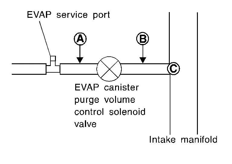 Disconnect purge hoses connected to EVAP service port A and EVAP canister purge volume control solenoid valve B.