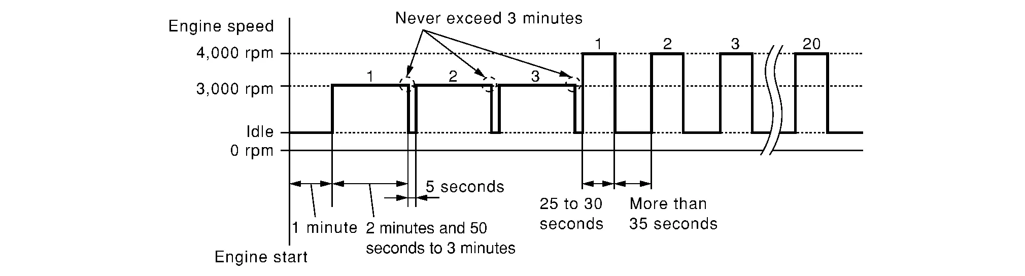 Increase the engine speed up to 3,000 to 3,500 rpm and keep it for 2 minutes and 50 seconds to 3 minutes.