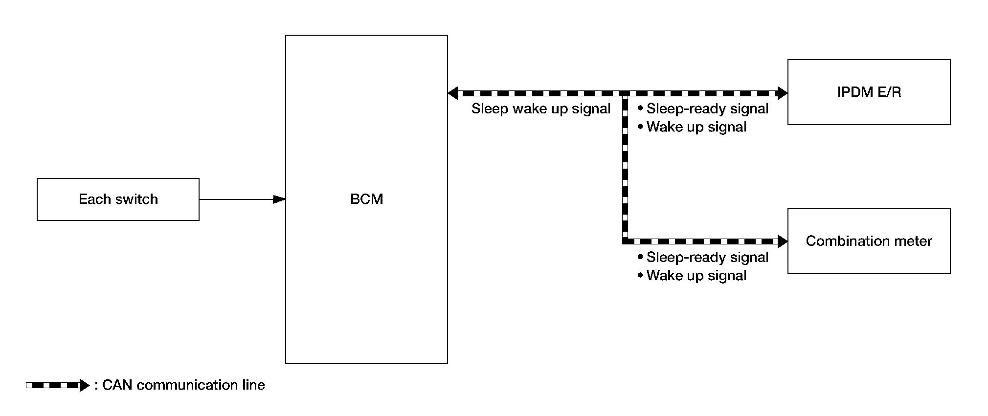 BCM receives the sleep-ready signal (ready) from IPDM E/R and combination meter via CAN communication.