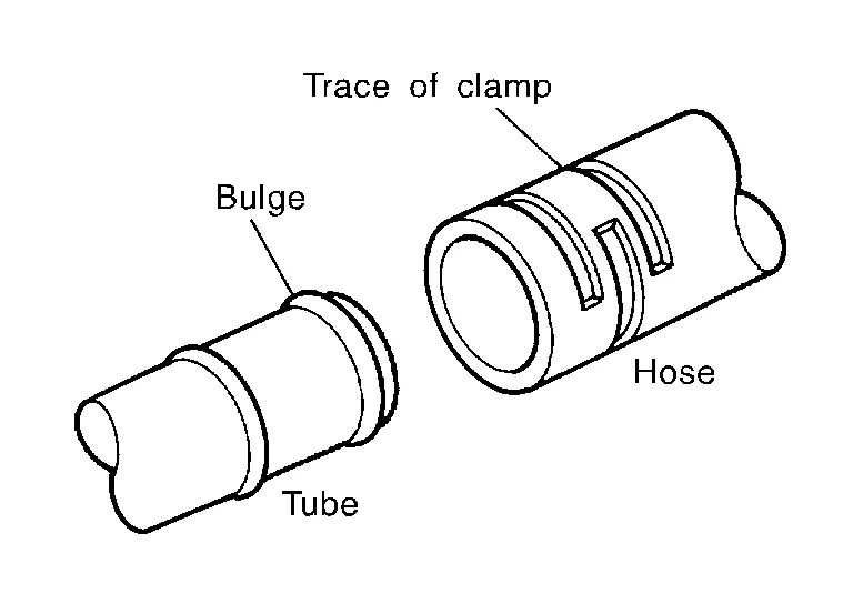 If old rubber hose is re-used, install hose clamp in its original position (at the indentation where the old clamp was). If there is a trace of tube bulging left on the old rubber hose, align rubber hose at that position.