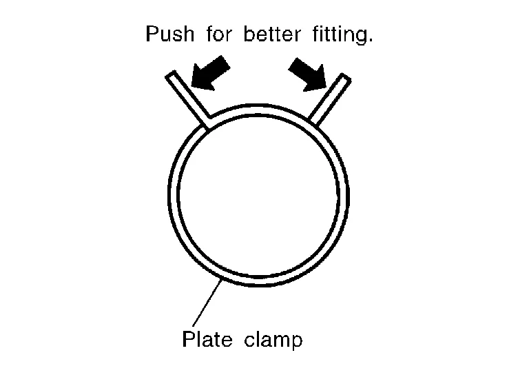After installing plate clamps, apply force to them in the direction of the arrow, tightening rubber hose equally all around.