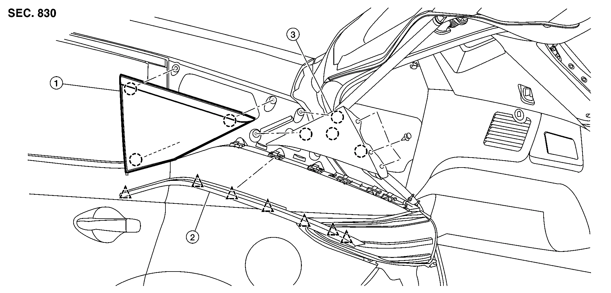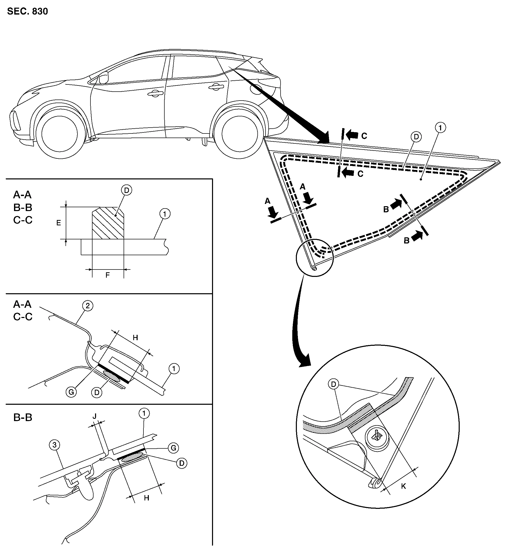 | 1. | Quarter window glass | 2. | Body side outer | 3. | Quarter window finisher |