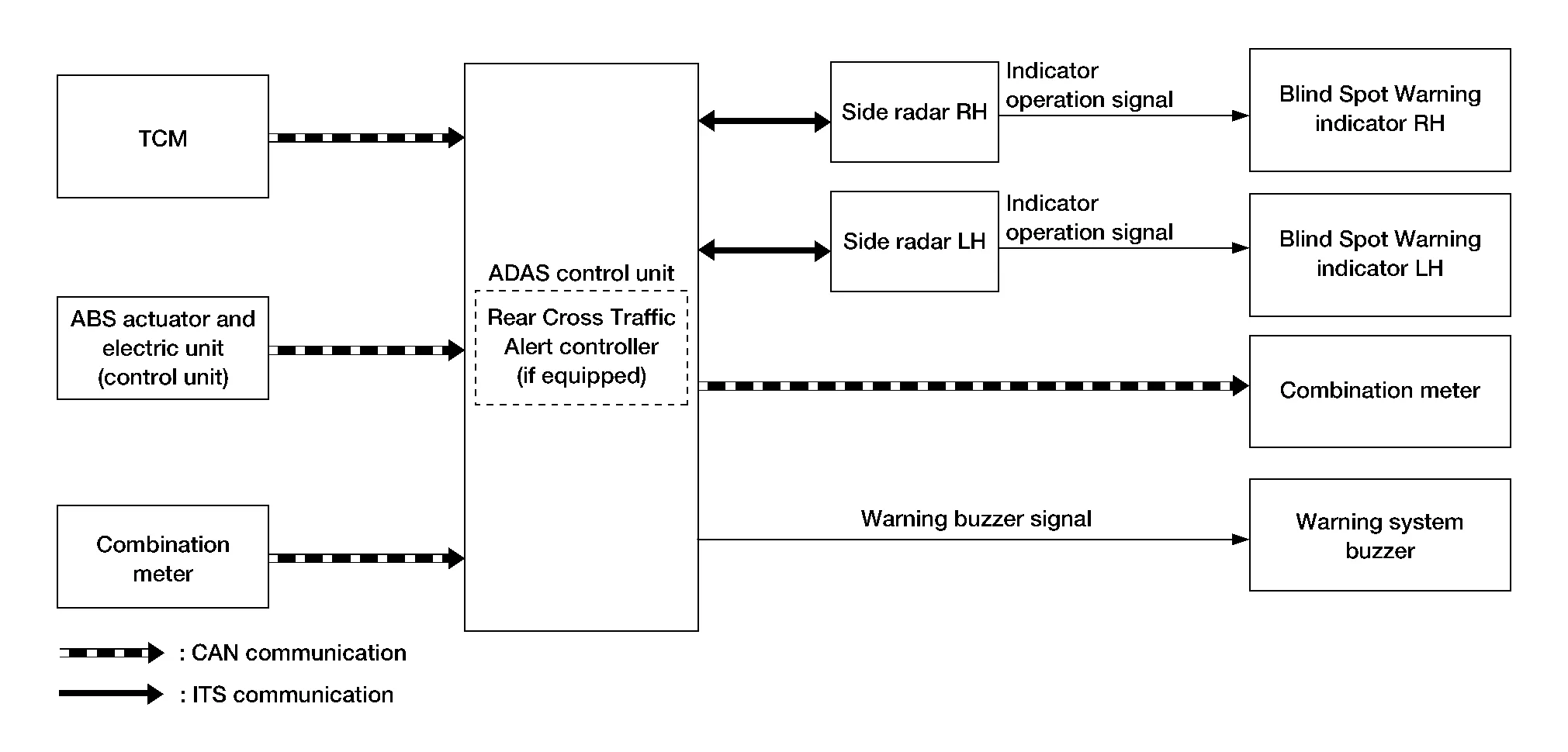 | Side radar LH, RH | ITS communication | Blind Spot Warning indicator signal | Transmits a Blind Spot Warning indicator signal to turn ON the Blind Spot Warning indicator. | |